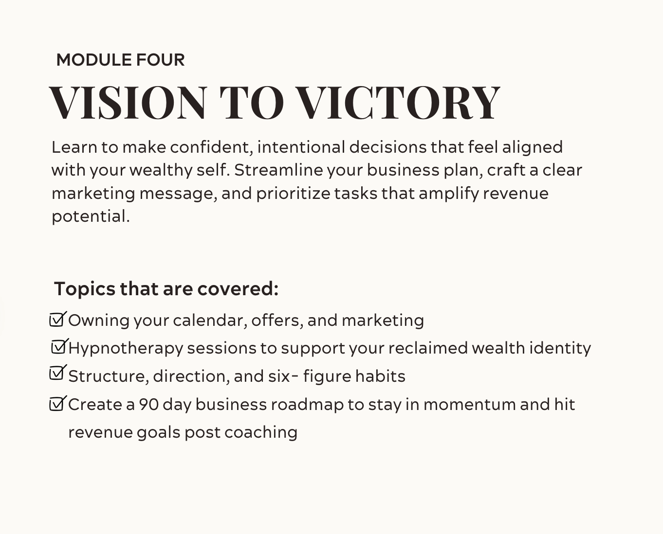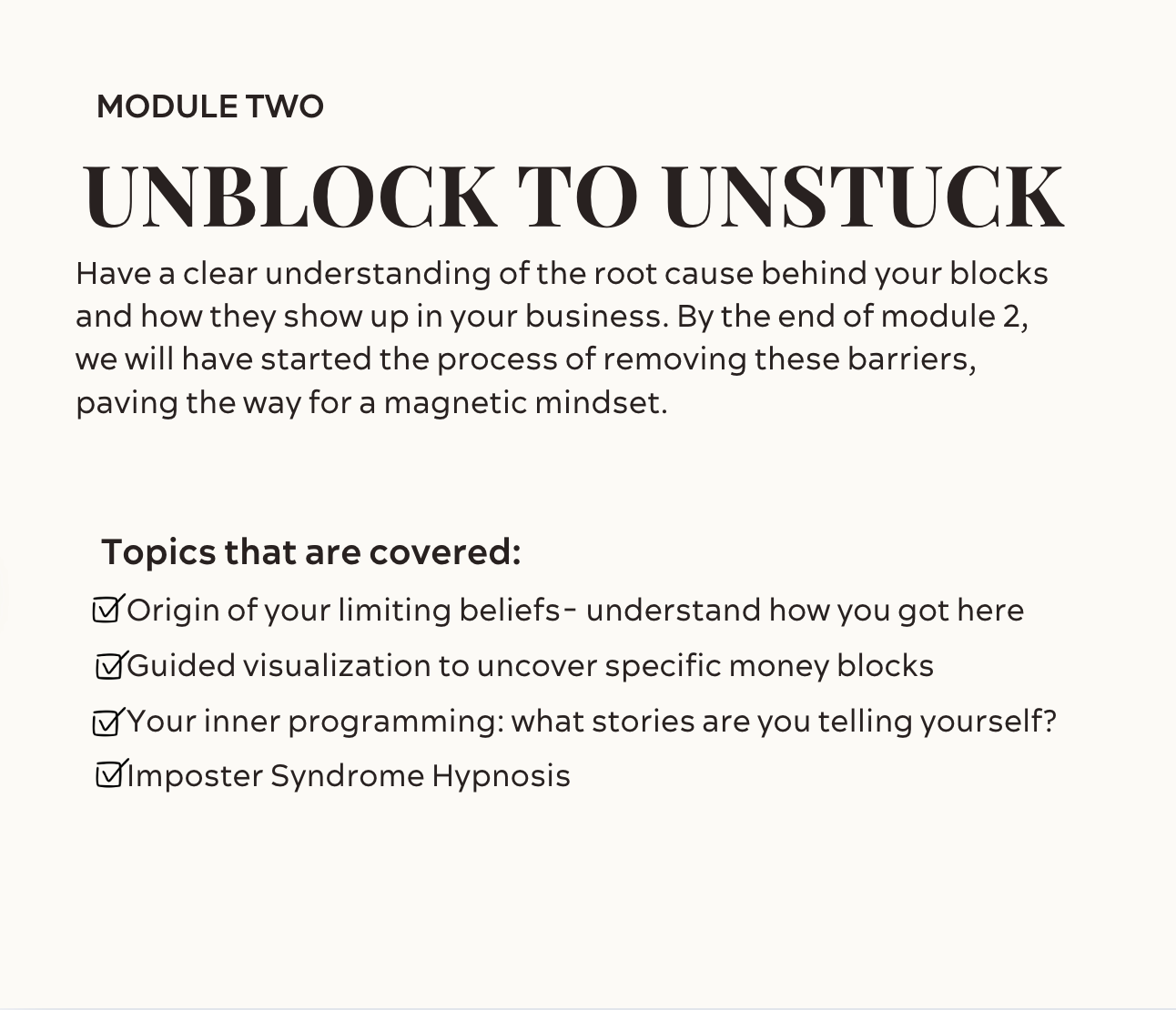 The Magnetic to Money Method isn’t just about reciting affirmations or building a vision board and hoping for the best. It’s a results-driven process that combines subconscious rewiring with aligned business strategy. What sets this program apart is the holistic approach to wealth building that addresses mindset, nervous system, and soul; bridging mindset and implementation—so you don’t just think like a six-figure CEO, you show up, impact, and lead like one.