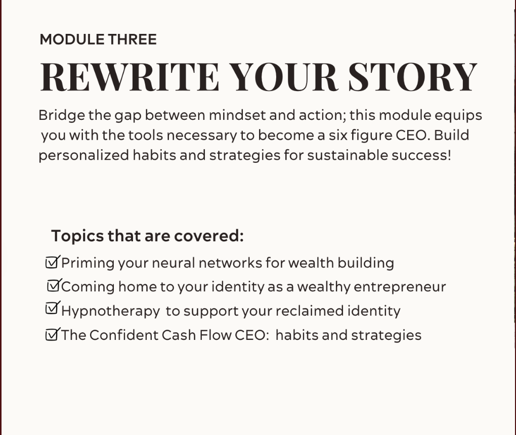 - embody a 6- figure CEO mindsets that magnetizes your dream clients.